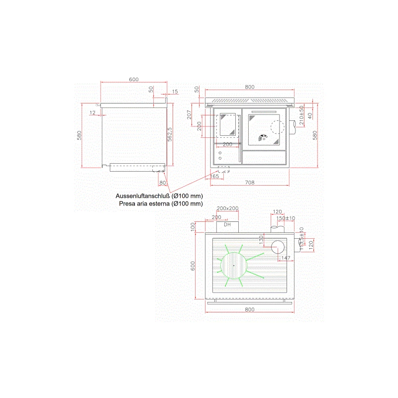 - Rauchrohranschluss 120mm, in der Höhe und seitlich verstellbar