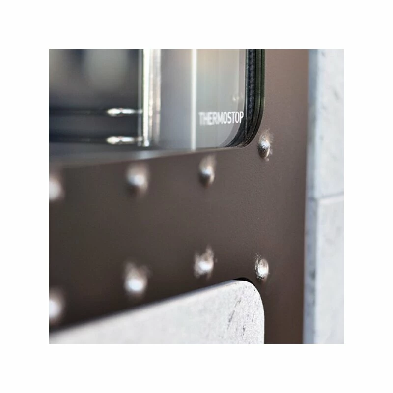 Die Feuerraumtür ist dreifach verglast und selbstreinigend. Dies zusammen mit der Kombination mit dem speziellen Einlass vorgewärmter Luft, garantiert eine saube Scheibe und eine gute Sicht aufs Feuer.