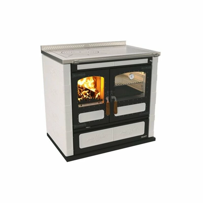 Die Holzherde der Serie L sind nostalgisch geprägt, die sich durch die Serpentin- oder die von Meisterhand handangefertigte Keramik-Verkleidung und die genieteten antiken Türen unterscheiden. Die Modelle der Serie L bieten eine tolle Sicht aufs Feuer und sind mit einem Edelstahl-Backofen ausgestattet.