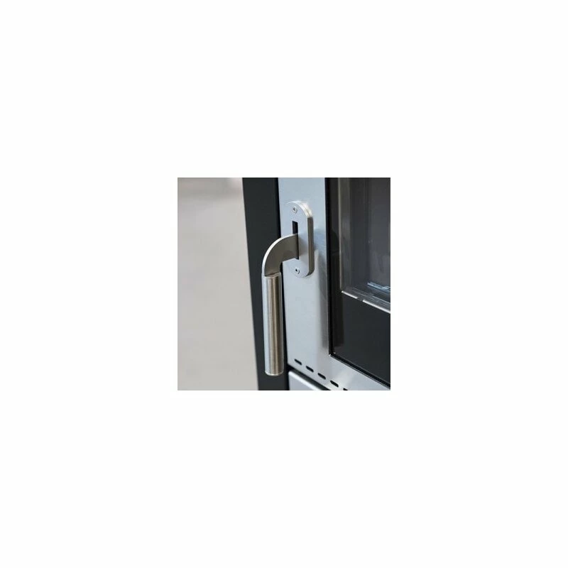 Die Feuerraumtür ist dreifach verglast und selbstreinigend. Dies zusammen mit der Kombination mit dem speziellen Einlass vorgewärmter Luft, garantiert eine saube Scheibe und eine gute Sicht aufs Feuer.