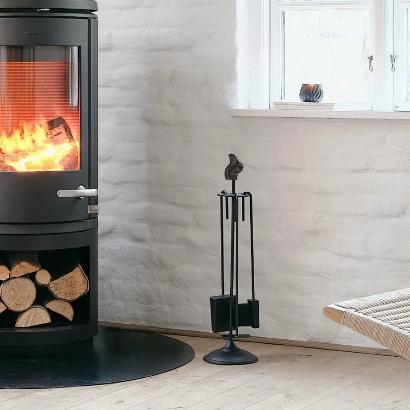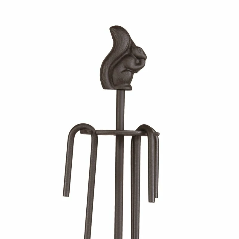Dreiteiliges Kaminbesteck mit gusseisernem Ständer und ist oben mit dem beliebten gusseisernem Eichhörnchen versehen.