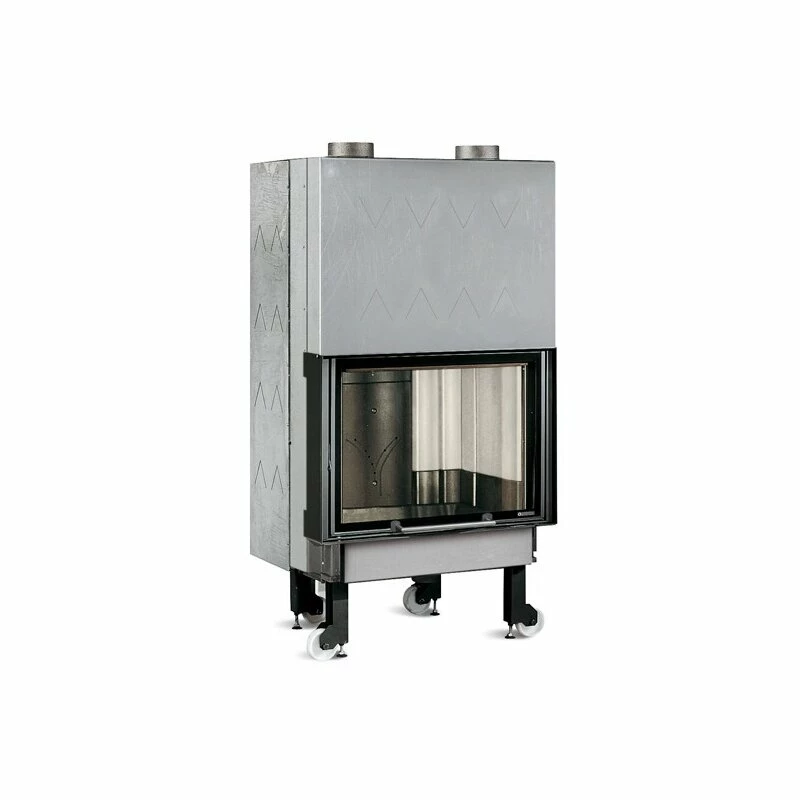 Die Kamineinsätze Monoblocco von La Nordica haben eine hochschiebbare Tür, die im Rahmen verschwindet. Die Konstruktion ist selbsttragend und alle mechanischen Teile abgedeckt. Zur besseren und einfachen Positionierung haben die Geräte Räder und sind in der Höhe verstellbar.