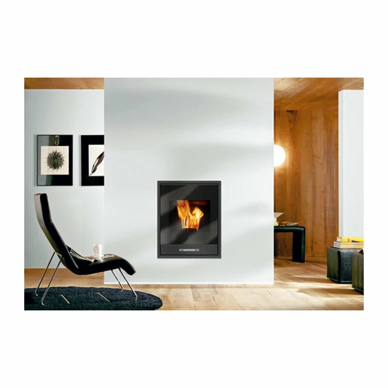 Dieser moderne Kamineinsatz von Edilkamin wird mit Pellets betrieben und ist wasserführend.