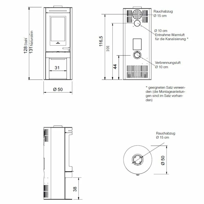 Dieser Holzofen im edlen Design begeistert durch seine moderne Technik. Der Ofen ist mit einer hochwertigen Verkleidung aus Stahl oder wahlweise Naturstein ausgestattet und bietet mit seinem großen Fenstereine ideale Sicht auf die Flammen im aus Gußeisen gefertigten Feuerraum. Die Tür schließt automatisch und ist mit einem Dämpfer ausgestattet.