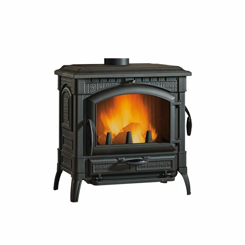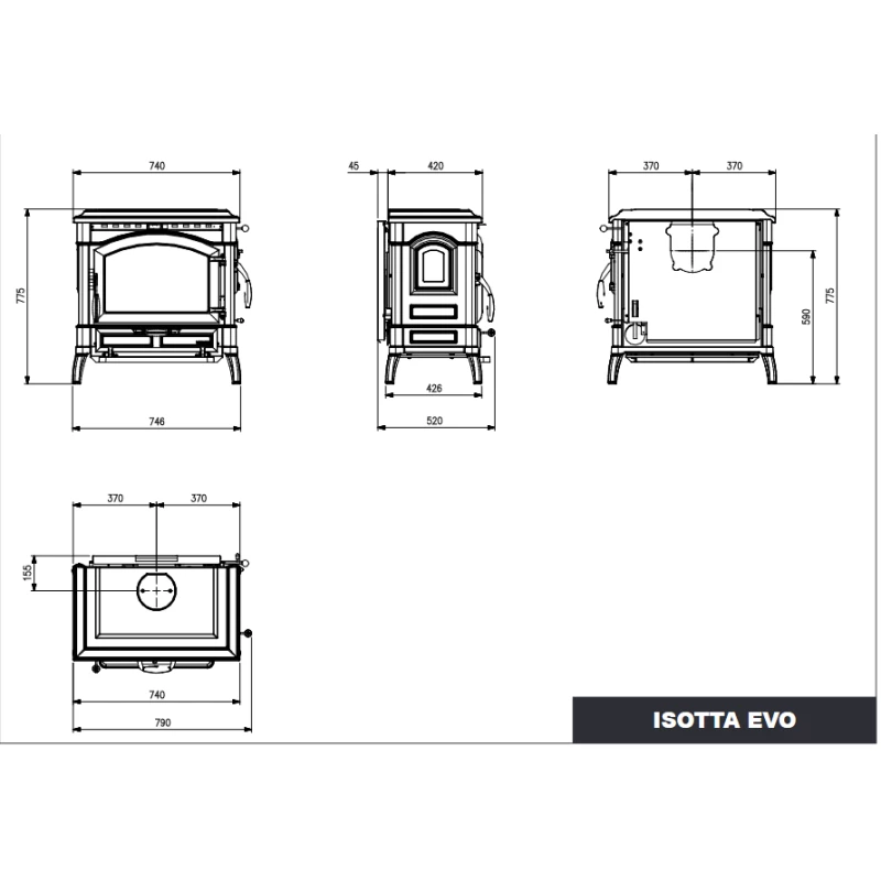 Der Kaminofen Isotta Evo besteht komplett aus Gusseisen in erstklassiger Qualität und mit ausgezeichneter Heizleistung; er weist ein edles, rustikales Design auf. Er ist geeignet für Holz und Briketts und hat eine große einflügelige Panoramascheibe an der Front, sie ist aus Keramikglas gefertigt und daher bis zu 750° hitzebeständig.