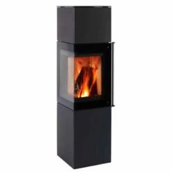 Panorama, ein kubistischer Kaminofen mit großem winkligem Glas, bietet einen schönen Einblick auf das Feuer aus mehreren Winkeln. Die große selbstschließende Tür des Modells trägt zur Bewahrung der geraden Linien bei und verleiht ihm ein schlankes und elegantes Aussehen.