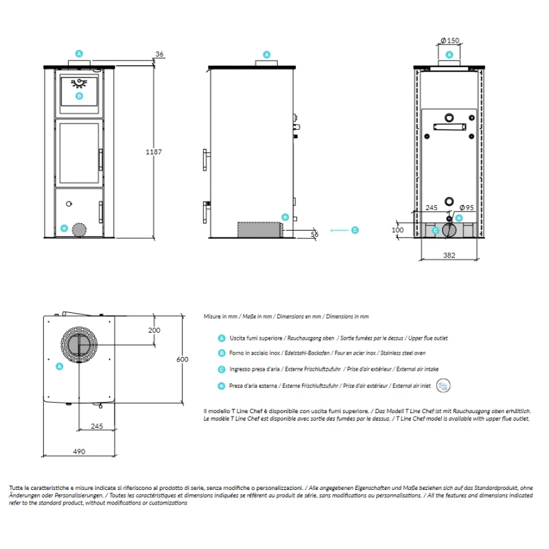 Der T Line Chef ist in schwarz lackiertem Stahl gehalten und ist mit dem zertifizierten H2O System® ausgestattet. Highlight des Ofens ist der tolle Backofen in Edelstahl. Die Brennkammer ist im Inneren mit einem Stahlschutz verkleidet, der einen Hohlraum zwischen Brennkammer und Stahlschutz bildet und einen Durchgang für die vorgewärmte Sekundärluft ermöglicht. Weitere wichtige Produkteigenschaften sind: Primär-, Sekundär- und Tertiärluft, automatische Luftregulierung, höhenverstellbarer Feuerrost und Feuerraumtür mit doppelt verglastem, selbstreinigendem Sichtfenster Shiny Glass®.