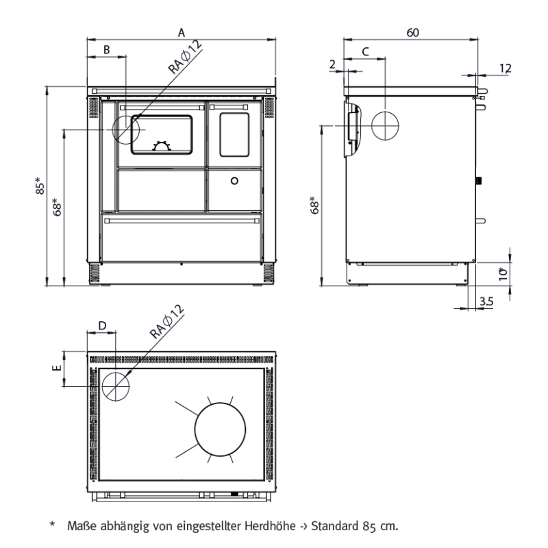 - Rauchrohranschluss 120 mm – hinten, seitlich, oben, hinten flexibel