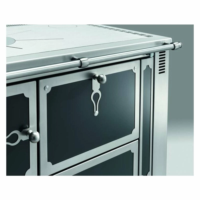 Die Edelstahlverkleidung mit schwarzen Einsätzen macht den Herd robust und gleichzeitig zu einer besonderen Blickfang.