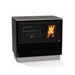 Dieser Holzherd beeindruckt mit seinen traditionellen Werten: Modernität, mattes Schwarz, Hochglanz Glasfronten und klare, gerade Linienführung.
