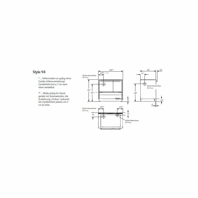 - Rauchrohranschluss seitlich: Höhe 730mm