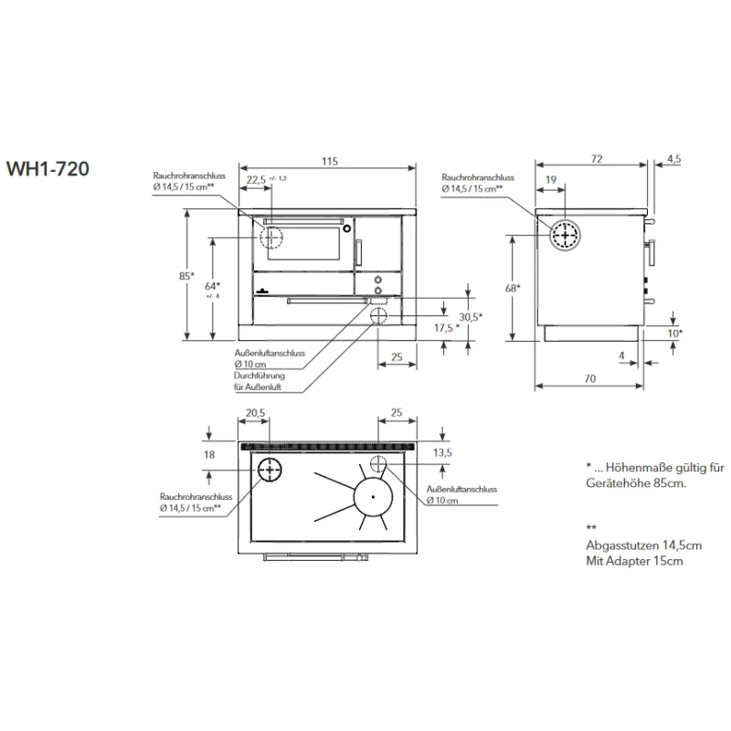 - Rauchrohranschluss seitlich: Höhe 680mm