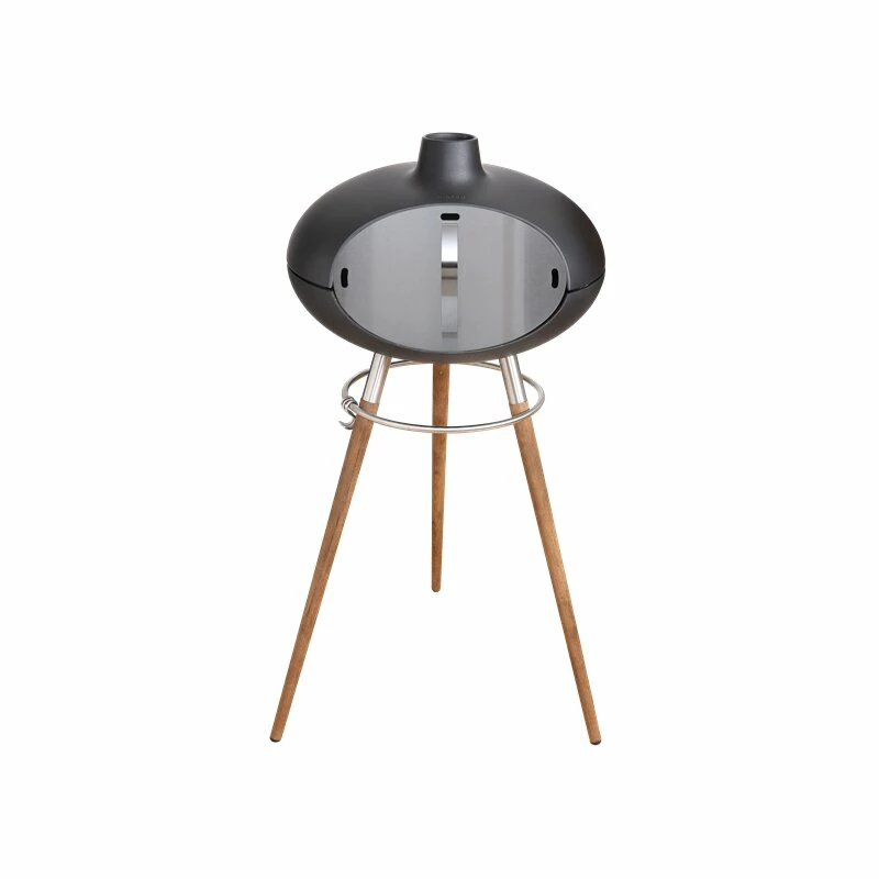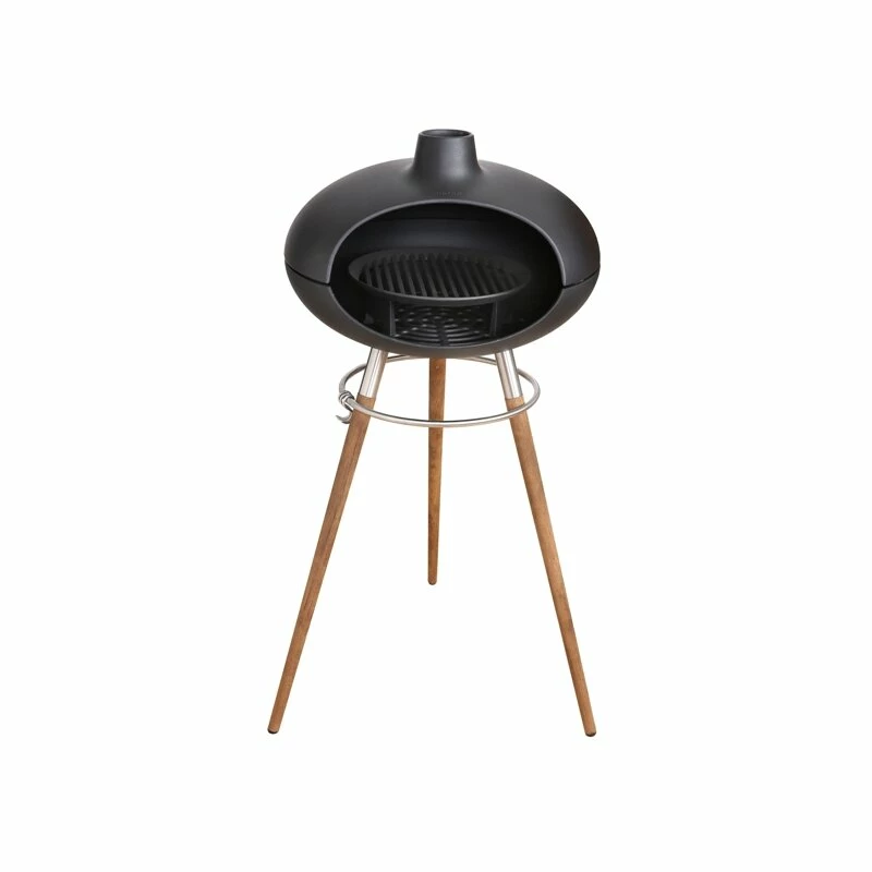 Der Grill aus hochwertigen Guss wird auf einem Unterteil, bestehend aus einem Ring aus rostfreiem Stahl und drei Beinen aus Teakholz montiert. An dem Ring sind 3 Haken angebracht, die man für Grillzubehör oder die Tür für den Forno benutzen kann.