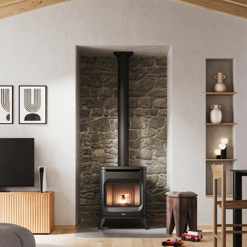 Der Pelletofen mit Gebläse aus dem Hause Cadel ist ein kompakter Pelletofen, der besonders durch seine außergewöhnliche Form auf Füßen und die Kombination der Materialien von Metall und Gusseisen auffällt. Der Ofen ist zeitlos, sodass er sich perfekt seiner Umgebung anpasst.
