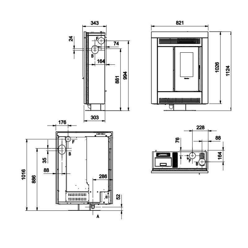 Das Besondere, die Wärme lässt sich bis zu 6 Meter in andere Räume kanalisieren, sodass Sie die Möglichkeit haben, die gewonnene Wärme auch in anderen Räumen des Hauses zu nutzen. Der Abgang ist dabei oben, hinten oder rechts möglich