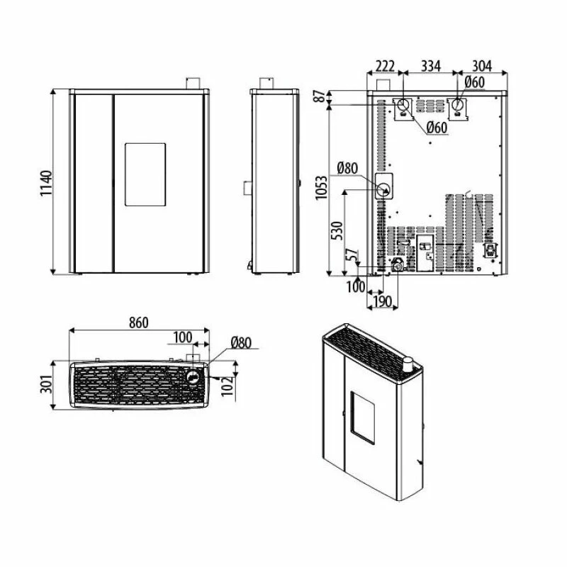 Bei diesem Modell werden die Pellets frontal auf der linken Seite eingefüllt, rechts befindet sich sodann die Tür. Der Ofen besitzt zudem eine Keramikzündkerze, welche eine reduzierte Einschaltzeit von 40 % gewährleistet. Weiterhin ist eine Abschaltfunktion der Ventilation und mehrere Luftverteilungslösungen zur Kanalisierung beider Luftauslässe vorhanden.
