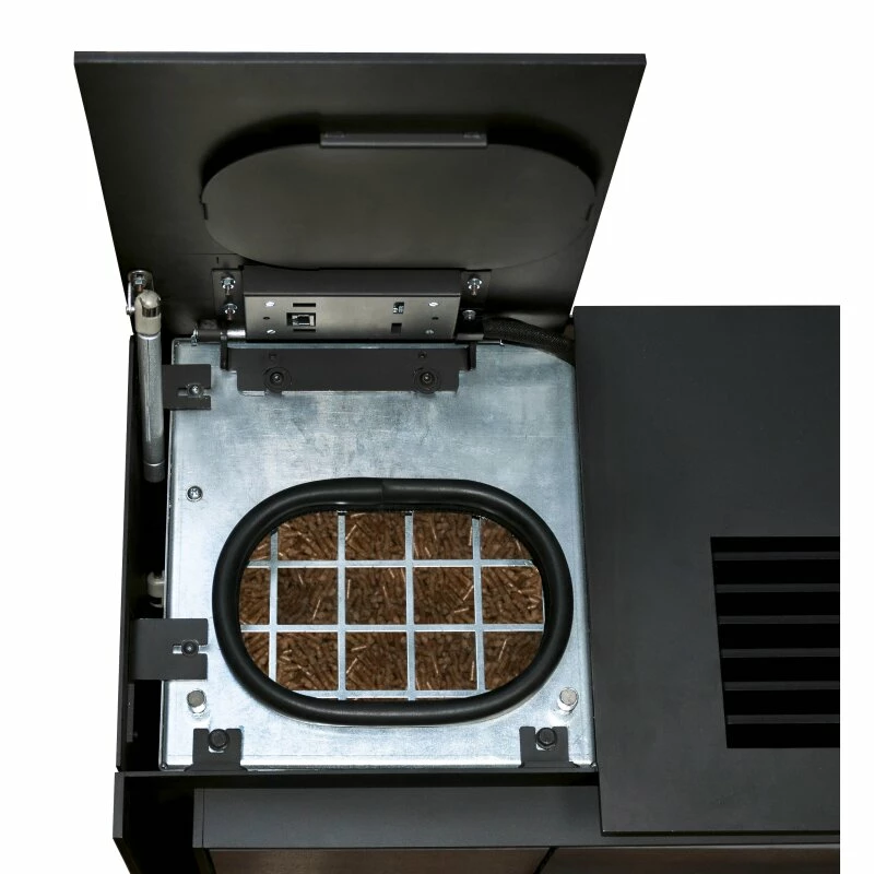Praktrische Features wie der extragroße Pellettank, das moderne Grafik-Display und die in der Höhe verstellbaren Füße machen das Gerät praktisch in der Anwendung. Neben der automatischen Brennertopf-Reinigungsfunktion und der Nachtabsenkung ist auch die Programmierung von automatischen Schaltzeiten und sogar die elektroniosche Steuerung des Konvektionsgebläses möglich.