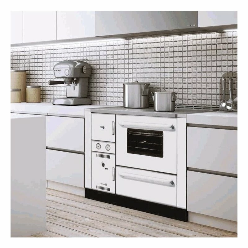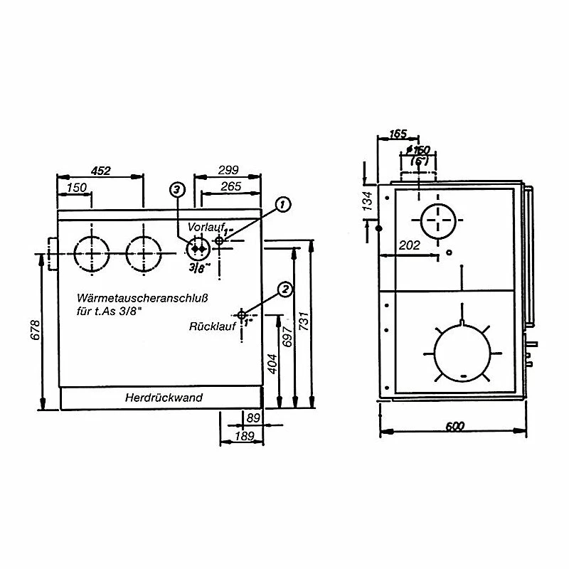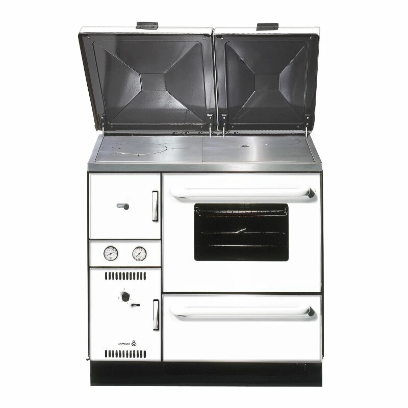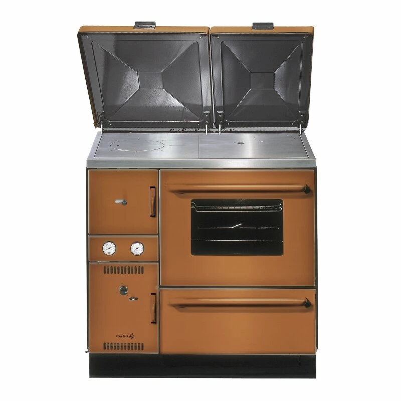 Der K 148 ist ein Herd, der mit seiner tollen Optik imponiert. Außerdem beeindruckt er auch durch einen massiven Herdrahmen aus Edelstahl, praktischen Kipphebelgriffen und einer robusten Stahlplatte. Der Zentralheizungsherd besitzt über eine Sekundärluftzuführung, durch diese wird eine bessere Ausnutzung des Brennstoffes und eine rußfreie Verbrennung ermöglicht. Zudem besitzt der Holzherd einen großen Feuerraum, in dem Holzscheite bis zu 42 cm von vorne oder oben getan werden können. Besonders ist, dass der Herd bei Winterroststellung bis zu 12 Stunden brennt. Während Sie kochen, können Sie den Rost mit der Kurbel stufenlos nach oben stellen. Dadurch spart man Brennholz und verringert die Wärmeabgabe an das Heizwasser. Die Verbrennungsluft und der Heizungsverlauf werden im Herd durch einen Temperaturregler exakt eingestellt und geregelt. Die Werte kann man dann über das Thermometer im Sichtfenster kontrollieren. Serienmäßig ist enthalten: thermische Ablaufsicherung, Wärmetauscher, Thermo- und Manometer, Zentraleinrichtung mit Anheiz- und Abgasumlenkklappe.