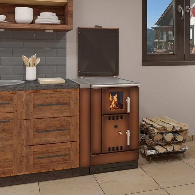 Elegant, hocheffektiv und komfortabel: Der K 158 überzeugt mit seiner ansprechenden Optik, der isolierten Abdeckhaube, dem massiven Edelstahlherdrahmen und der robusten Stahlplatte. Heiz- und Aschetür werden konvektiv durch Luft gekühlt, die Primär- und Sekundärluftzuführung ist regelbar. Der K 158 verfügt über einen groß dimensionierten Feuerraum, in den problemlos Holzscheite bis zu 37 cm von vorne oder oben eingebracht werden können. Bei Winterroststellung brennt der Herd bei Kleinstellung bis zu 12 Stunden. Für den Kochbetrieb kann der Rost dank Kurbel auch während des Betriebes stufenlos nach oben verstellt werden, sie sparen so Brennholz und verringern die Wärmeabgabe an das Heizwasser. Die thermische Ablaufsicherung und der Wärmetauscher sind serienmäßig enthalten.
